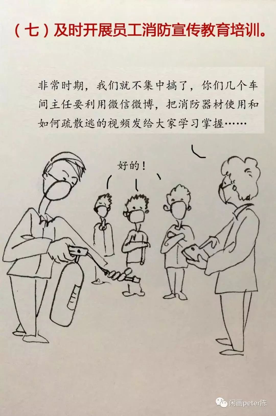 各企業、各單位要及時組織消防安全培訓,使每名員工做到“一懂三會”(即:懂本場所火災危險性,會報火警、會撲救初起火災、會疏散逃生)。換崗、新入職員工必須經過消防安全培訓方可上崗。消防控制室值班人員及從事電焊、氣焊的人員,必須經培訓考試合格持證上崗。要在公告欄、過道等顯著位置張貼消防宣傳畫,利用電子屏、員工微信群廣泛開展消防宣傳提示。