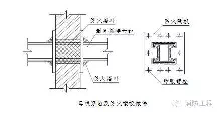 7.封閉插接母線在穿過(guò)墻及防火樓板時(shí),在母線周圍填充防火堵料,具體做法見(jiàn)上圖。