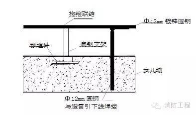 1.本工程在建筑物頂屋面女兒墻上與挑檐上,裝設(shè)Φ10鍍鋅圓鋼做避雷帶 連接條,所有高出屋面的設(shè)備及物體,均采用Φ16鍍鋅圓鋼固定在設(shè)備及物體的頂端作避雷針,采用Φ10鍍鋅圓鋼,一端與避雷針焊接,另一端與屋面女兒墻上避雷帶焊接