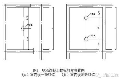 ⑴在配管前應(yīng)按設(shè)計(jì)圖紙確定好配電設(shè)備、各種箱、盒及用電設(shè)備位置。在樓板內(nèi)配管時(shí),在土建摸板支設(shè)完畢后,根據(jù)設(shè)計(jì)圖紙?jiān)诿迳嫌眉t油漆標(biāo)注燈具、插座、探測(cè)器、接線盒、配電箱的位置。當(dāng)室內(nèi)只有一盞燈時(shí),其燈位盒應(yīng)設(shè)在縱橫墻(或梁)凈尺寸中心線的交叉處;有兩盞燈時(shí),燈位盒應(yīng)設(shè)在短軸線墻(或梁)凈尺寸中心線與長(zhǎng)軸線墻(或梁)凈尺寸1/4 的交叉處,如圖1 所示。公共建筑走廊照明燈具,應(yīng)按其頂部建筑結(jié)構(gòu)不同,來(lái)合理地布置燈位盒的位置,當(dāng)走廊頂部無(wú)凸出樓板下部的梁時(shí),除考慮好樓梯對(duì)應(yīng)處的燈位盒外,其他燈位盒宜沿走廊中心線均勻分布,如走廊頂部有凸出樓板下部的梁,確定燈位時(shí),應(yīng)考慮到燈位與梁的位置關(guān)系,燈位盒與梁之間的距離應(yīng)協(xié)調(diào),均勻一致,力求實(shí)用美觀。