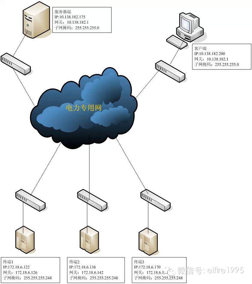 到達(dá)現(xiàn)場后,供電公司給出了如下圖所示的三個(gè)終端網(wǎng)絡(luò)參數(shù)、一個(gè)服務(wù)器端網(wǎng)絡(luò)參數(shù)、一個(gè)客戶端網(wǎng)絡(luò)參數(shù)(具體網(wǎng)絡(luò)結(jié)構(gòu)尚不清楚,初步簡化為下圖)。