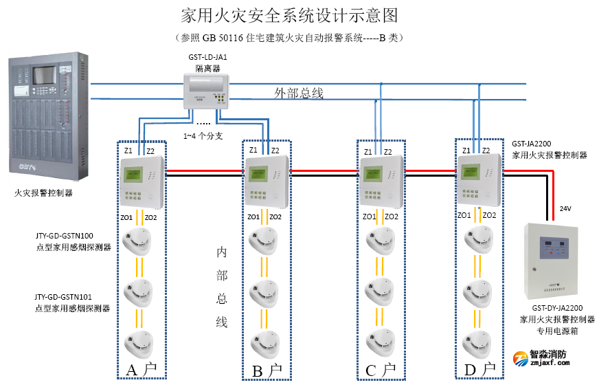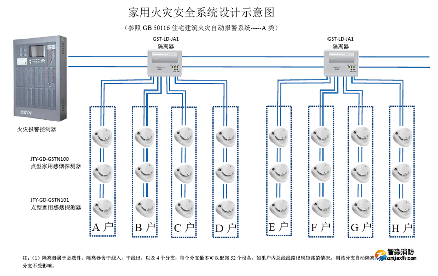 GST家用火災安全系統B類設計中,隔離器為可選件,不占地址,家用火災報警控制器和專用電源箱、家用探測器均占地址點。