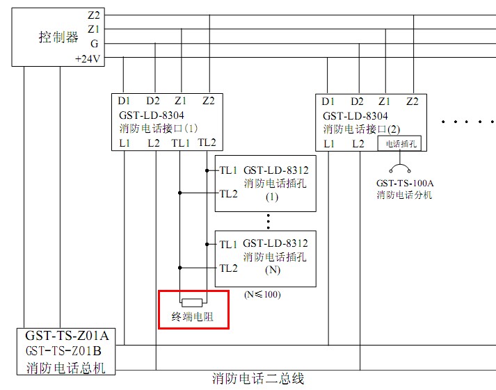 海灣GST-LD-8312消防電話插孔端子X(jué)T1電話線輸入端,端子X(jué)T2電話線輸出端,接下一個(gè)電話插孔,最末端電話插孔XT2接線端子接4.7kΩ終端電阻。