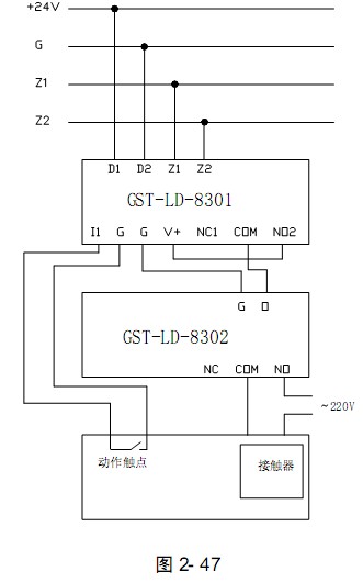 GST-LD-8302切換模塊與8301模塊配合使用控制交流設(shè)備的方法如圖2- 47 所示: