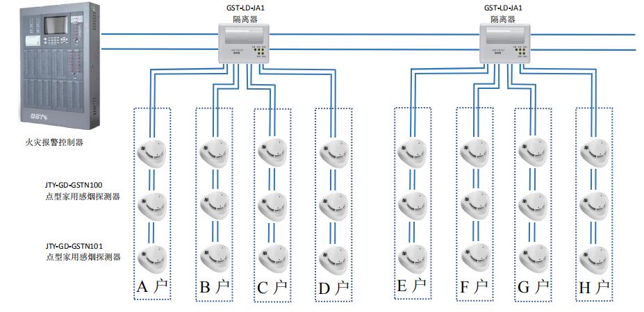 GST海灣家用火災安全系統 A 類設計中,隔離器為必選件,不占地址,將回路中家用探測器按規劃進行地址分配。
