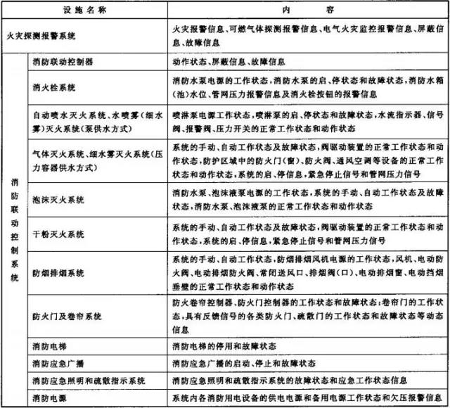 2、消防控制室內設置的消防設備應能監控并顯示建筑消防設施運行狀態信息,并應具有向城市消防遠程監控中心(以下簡稱監控中心)傳輸這些信息的功能。建筑消防設施運行狀態信息見下表1。