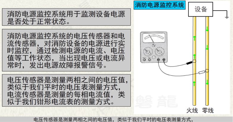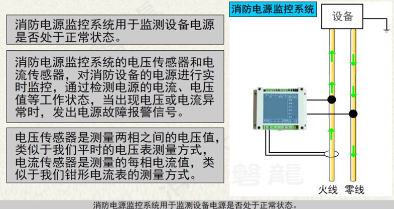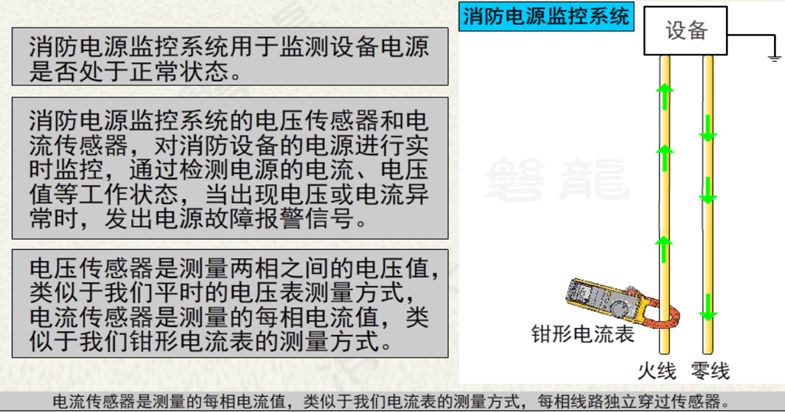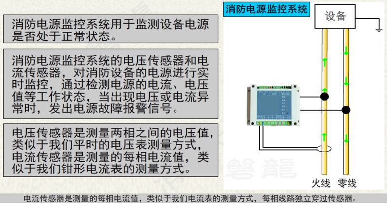 消防設備電源監控系統用于監控消防設備電源工作狀態,在電源發生過壓、欠壓、過流、缺相等故障時能發出報警信號的監控系統,由消防設備電源狀態監控器、電壓傳感器、電流傳感器、電壓/電流傳感器等部分或全部設備組成。