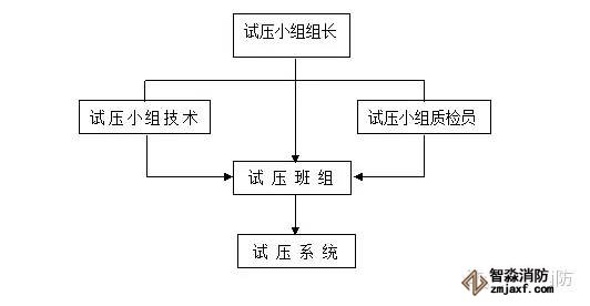 試壓時(shí)成立專門的試壓小組,試壓小組設(shè)組長一人,試壓時(shí)聽從組長指揮,試壓組織方塊圖如下: