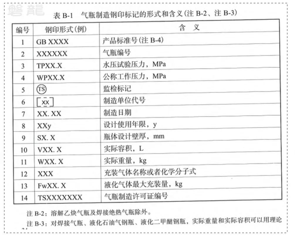 2、鋼印標記的形式含義,如圖表所示,其中,與維護保養相關的,主要是實際容積(V字母開頭)、制造日期(XX.XX)和設計使用年限(年限+y字母結尾):