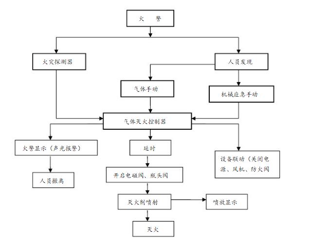 本系統在保護區內設置有氣體滅火控制器、煙感、溫感、聲光報警、警鈴、放氣指示燈、緊急啟動按鈕。當有火情時,煙感、溫感同時探測到火災信號反饋到氣體滅火控制器,警鈴和聲光器報警,保護區內人員開始疏散,系統延遲 20 秒后,滅火控制器啟動七氟丙烷滅火裝置,開始向保護區噴放滅火劑,同時保護區門口的放氣指示燈點亮,警告人員不得入內。如在火情時,報警系統出現故障,可通過保護區門口的緊急起停按鈕,手動按下進行人工放氣。如出現誤報警狀態,也可通過該按鈕,停止向保護區放氣。