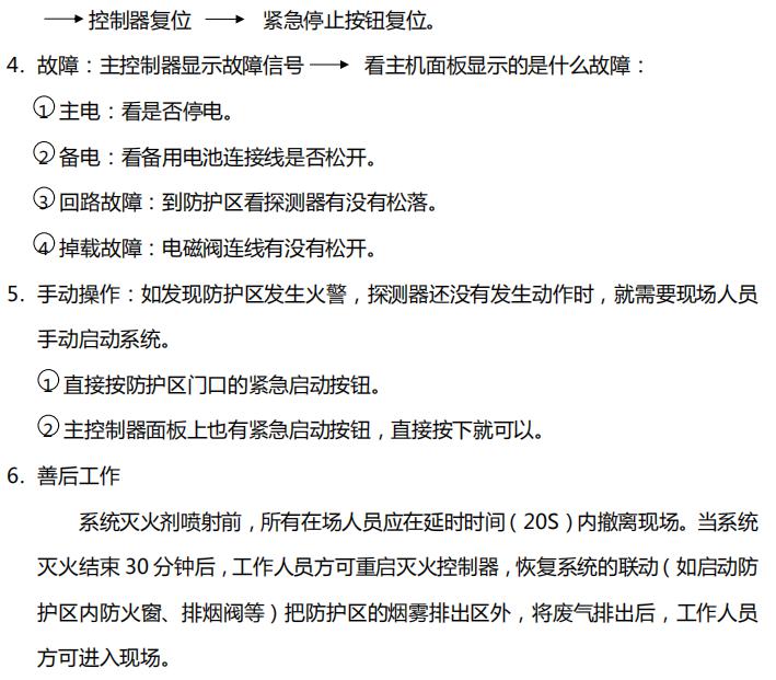 若因探測器誤動作發出火災聲光報警,在查看現場確定無火情后可按下手動控制盒內或控制器上的緊急停止按鈕,阻止控制器滅火指令的發出,不啟動滅火裝置,以免造成不必要的浪費和混亂。