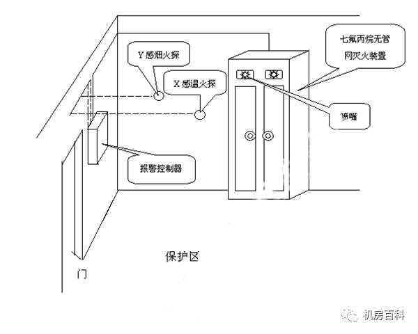 1)每個保護區的地板下、室內空間層及吊頂天花內需設置噴嘴、煙感探測器和溫感探測器。為了節省投資成本,保護區之間的氣體采用共享設計,減少了滅火藥劑用量,而煙感探測器和溫感探測器則仍然保持警報的功效。