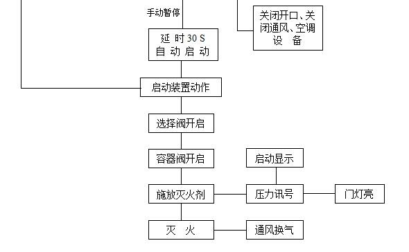 發(fā)生火災時,當一路探測器報警后,設在該防護區(qū)域內的警鈴動作;兩路探測器都報警后,設在該防護區(qū)域內外的蜂鳴器及閃燈動作;系統(tǒng)進入延時階段,控制盤完成相關設備的聯(lián)動控制。經過延時后,控制盤輸出24V直流信號電源啟動儲氣瓶組上的電磁閥,打開儲氣瓶組釋放滅火劑氣體,滅火劑沿噴射短管和噴頭輸送到防護區(qū)域滅火。如值班人員先于火災探測系統(tǒng)發(fā)現(xiàn)火情,當用手提式滅火器或其它移動式滅火設備無法撲滅火災時,可直接手動啟動來滅火。如發(fā)現(xiàn)是系統(tǒng)誤動作,或確有火災發(fā)生但僅使用手提式滅火器和其它移動式滅火設備即可撲滅火災,可按下設在防護區(qū)域門外的緊急止噴按鈕,可以使系統(tǒng)暫時停止釋放藥劑。如需繼續(xù)開啟氣體滅火系統(tǒng),則只需松開緊急停止開關即可。