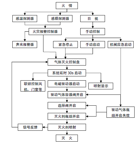 當火災探測器感溫探測器、感煙探測器)探測到火情后,將火災信號反饋到火災報警控制器,火災報警控制器控制聲光報警器,發出撤離報警信號。同時,火災報警控制器將信號傳遞給氣體滅火控制盤,由氣體滅火控制盤控制聯動設備,30 秒延時后,向電磁驅動器發出啟動信號(DC24V,1.5A),電磁驅動器開啟驅動氣體容器閥,驅動氣體順序開啟選擇閥、滅火劑瓶組容器閥,釋放滅火劑,滅火劑通過噴嘴噴放到保護區中,達到滅火目的。當滅火劑流經系統管路時,信號反饋裝置動作,電信號反饋到氣體滅火控制盤,表明滅火劑已噴放。