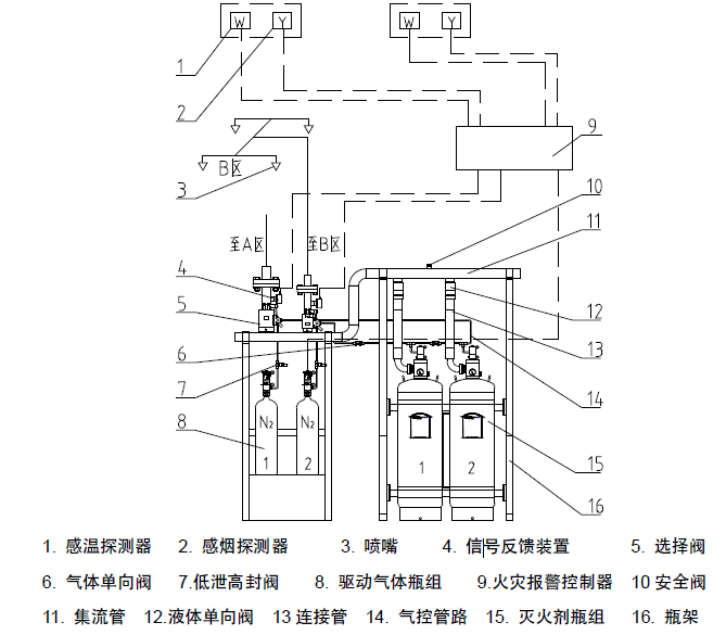 系統由滅火劑瓶組、驅動氣體瓶組、選擇閥、液體單向閥、連接管、集流管、安全閥、信號反饋裝置、氣體單向閥、低泄高封閥、噴嘴、氣控管路、瓶架、驅動氣體瓶架等組成。